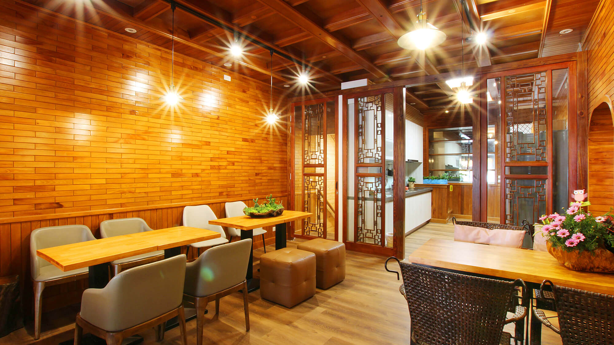 「嵩野 溪頭旅行·宿」大廳以木質建材打造出充滿鄉村氣息的空間,暖心的幸福溫度讓人放下了旅途疲憊。